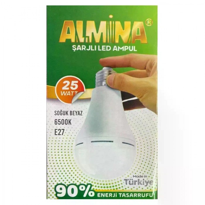 ALMINA DL-1025 25W - это перезаряжаемая аккумуляторная LED лампа с цоколем E27, которая имеет встроенный аккумулятор для аварийного питания, автоматически переходящий с сети на аккумулятор во время отключения света, обеспечивая 2-3 часа автономной работы и яркий свет для бытового использования.