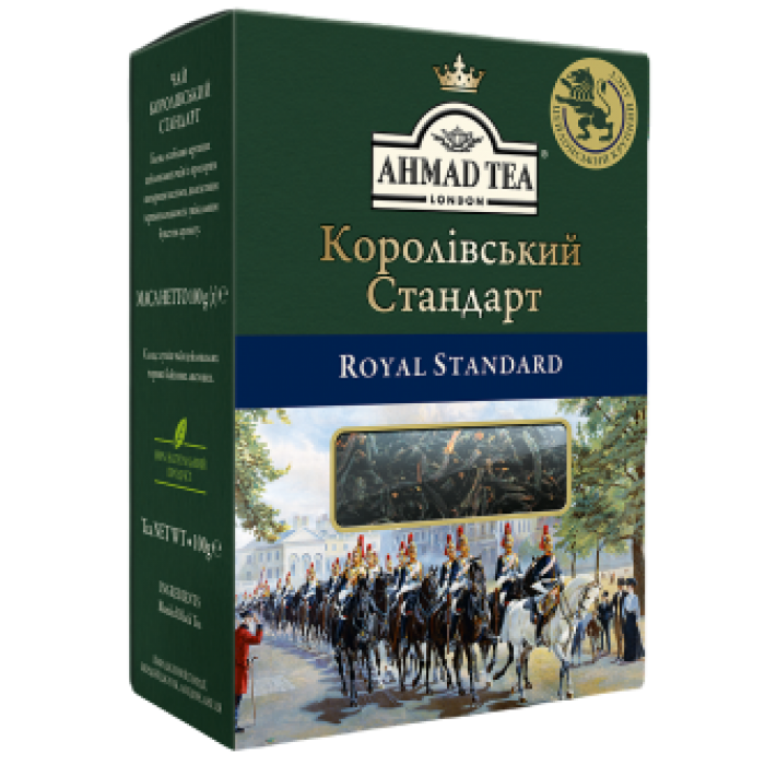 Чай Ahmad Tea Королевский Стандарт - бленд крупнолистовых цейлонских чаев с прозрачным янтарным настоем, благородным терпким вкусом и уникальным букетом аромата. Во время заваривания целые чайные листья медленно и плавно разворачиваются. Настой крупнолистового чая, как правило, менее крепкий, но ароматный. Классическим дополнением к этому чаю станет долька лимона. Чай создает торжественную, церемониальную атмосферу.