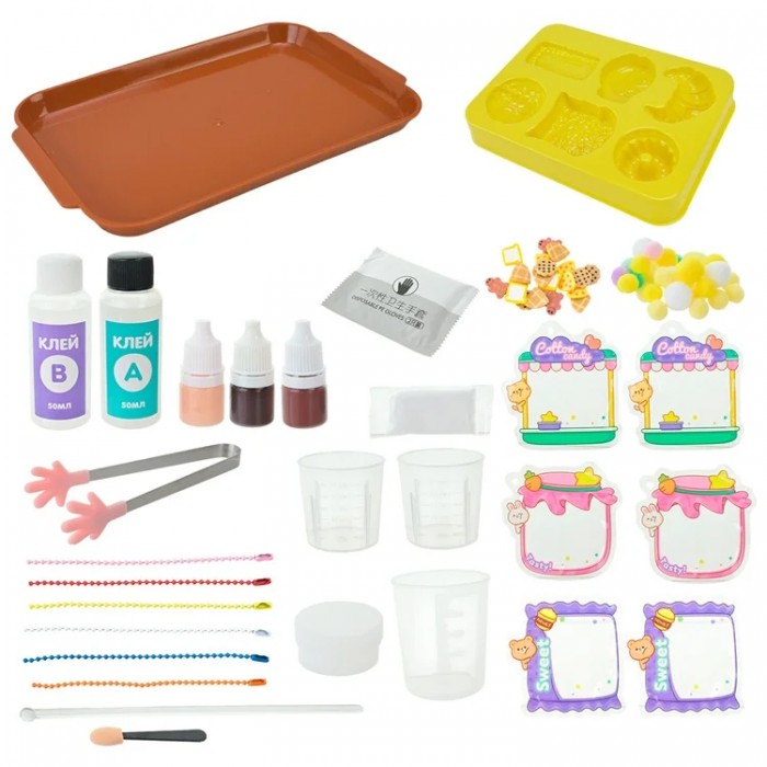 Комплектация: 2 баночки клея A и B (по 50 мл); мерный стакан; 2 чашки для смешивания цветов; палочка для смешивания; 3 пигмента; формы; палочка с губкой; средство для снятия формы; бархатный порошок; мягкие шарики; мягкие элементы из глины; силиконовый держатель; квадратная форма; 6 мультяшных пакетиков; 6 цепочек из цветных бусинок.
