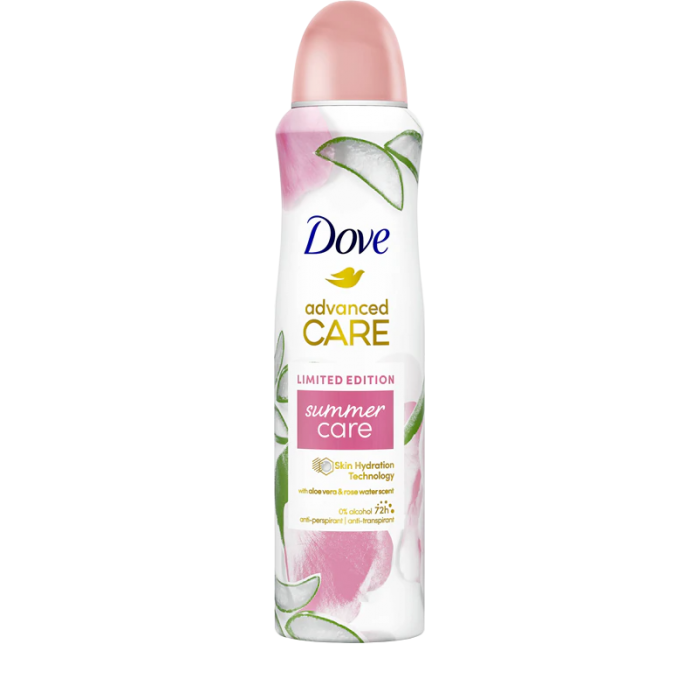 Подготовьтесь к жаркому лету! Антиперспирант-спрей Dove Advanced Care Summer Care защитит вас даже в самые теплые дни. С 72-часовой защитой от избыточного потоотделения и запаха вы можете наслаждаться каждым моментом — на пляже, летнем фестивале или вечерней прогулке. Нежный аромат алоэ вера и розовой воды освежит вас и наполнит ваш день настоящей летней атмосферой. Кроме того, благодаря увлажняющей технологии кожа ваших подмышек будет шелковисто-гладкой.