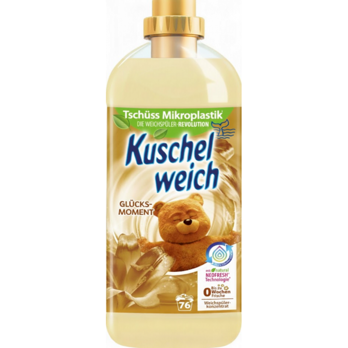Кондиционер без микропластика Kuschelweich Момент Счастья поражает своей долговременной свежестью , которая сохраняется до восьми недель. Идеально скоординированная текстура была оснащена запатентованной технологией свежести «natural neofresh®» и, в сочетании с биоразлагаемым жемчугом свежести, обеспечивает мягкое да приятное к коже впечатления от ношения.