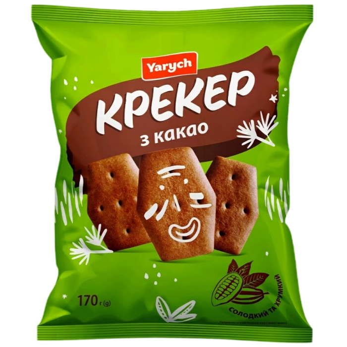 Крекер Yarych с какао - популярный вкус в удобном формате упаковки. Хрупкая структура делает угощение легким, воздушным, рассыпчатым и в то же время потрясающе нежным! Главная особенность печенья заключается в том, что оно достаточно долго не черствеет.