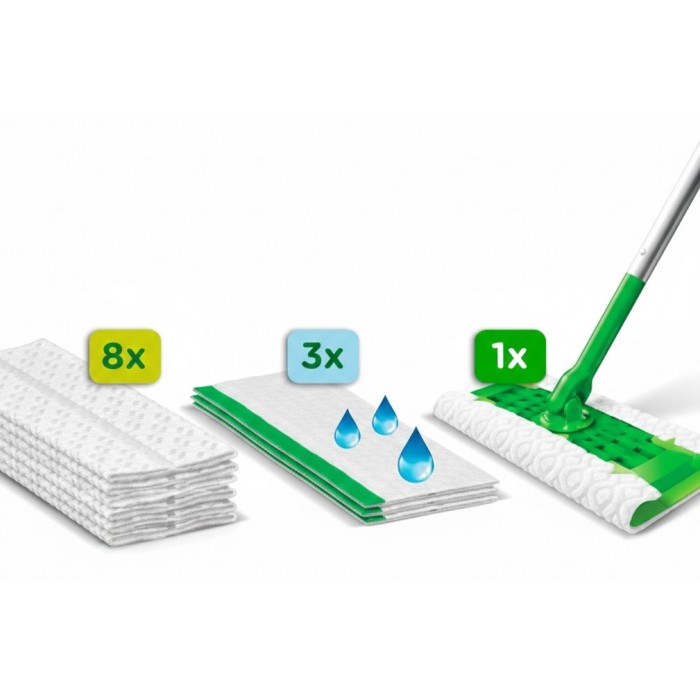 - Набор из 1 швабры для пола + 8 сухих салфеток для пола + 3 влажных салфетки для пола.