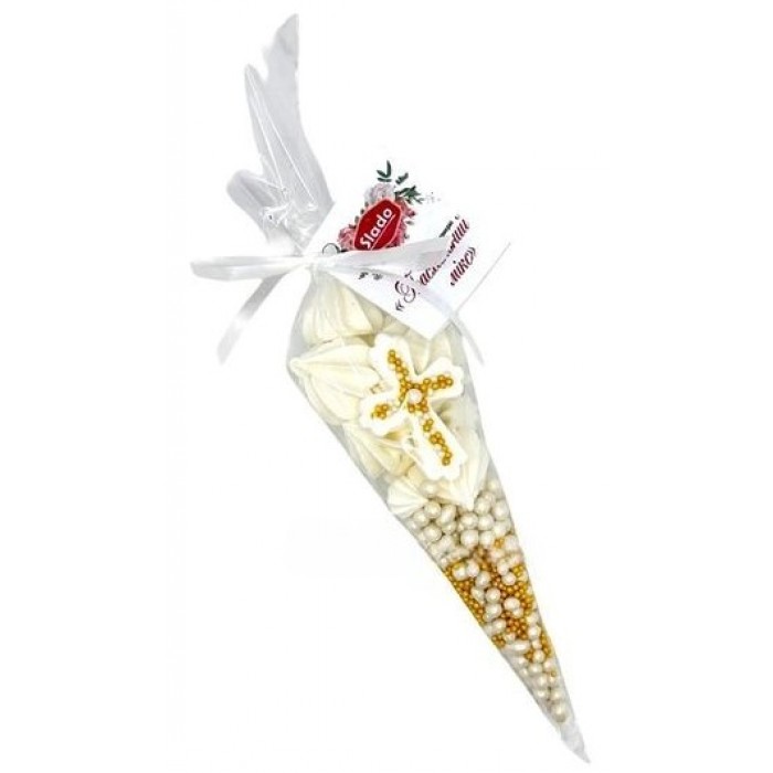 В состав набора входит: минибезе, микробезе, крестик белый с золотой посыпкой, посыпка круглая металлизированная золотая, посыпка рисовые шарики глазированные белые перламутровые D=5 мм.