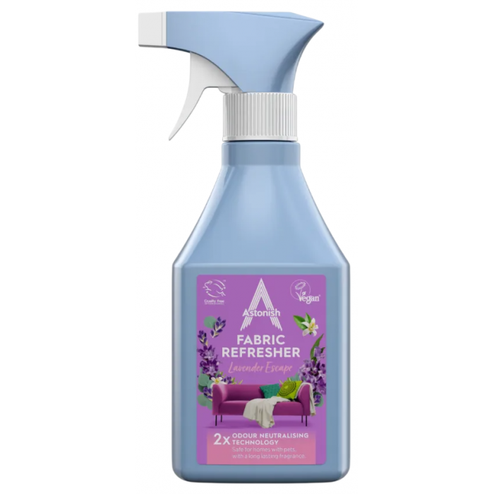 Astonish Fabric Freshener Lavender Escape — освежитель для тканей с нежным ароматом лаванды. Устраняет неприятные запахи и придаёт вещам ощущение чистоты и свежести без необходимости стирки.