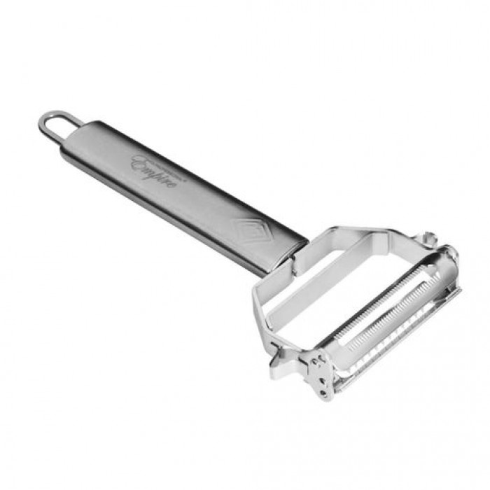 Овощечистка из нержавеющей стали Empire EM-9529 Овощечистка, нож профессиональная изготовлена из высококачественной нержавеющей стали. Очень острые лезвия помогут быстро почистить картофель, любой другой овощ или фрукт от кожуры. По бокам два удобных микро-ножа для комфортного удаления "глазок". Второе основное лезвие предназначено для шинковки корейской морковки или для тонкой нарезки овощей. Это именно тот инструмент, с которым изнурительная чистка овощей превращается в легкое и непринужденное занятие.