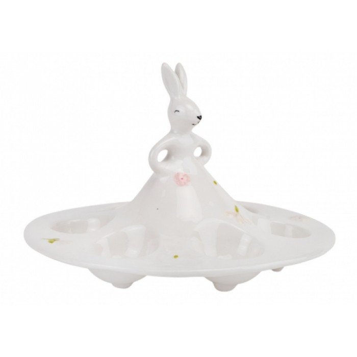 Эта изысканная керамическая подставка предназначена для хранения 6 яиц, создавая эффект стильного и праздничного оформления пасхального стола. В центре композиции возвышается милый кролик, выполненный в нежном белом цвете с декоративными цветочными элементами.
