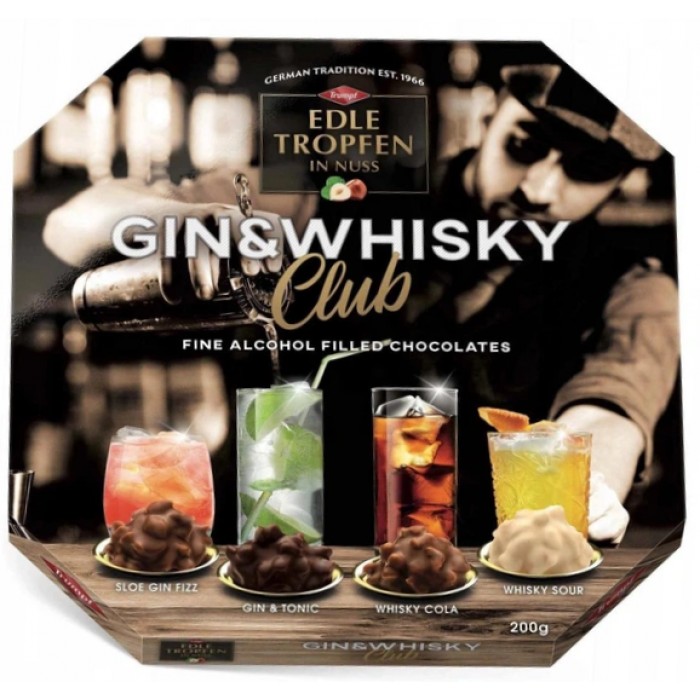 Trumpf Edle Tropfen In Nuss Gin Whisky с элитным алкоголем - это настоящее произведение кондитерского искусства от немецкой компании Trumpf, что уже много лет радует ценителей сладостей своими эксклюзивными десертами. Этот продукт сочетает в себе нежный шоколад, хрустящие орехи и изысканные алкогольные наполнители с джином и виски, что придает конфетам неповторимый аромат и вкус.