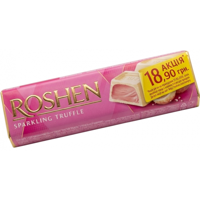 Батончик Roshen Truffle Sparkling — це ніжний десерт з оригінальним характером. Усередині — світло-рожева трюфельна начинка з додаванням напівігристого вина (3%), що дарує легкий винний відтінок і делікатну солодкість. Зверху батончик вкритий білою кондитерською глазур’ю з кавовою ноткою, яка створює гармонійне поєднання смаків і текстур. Формат зручний для перекусу або десерту до кави.