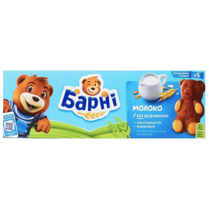 Бісквіт Барні з молочною начинкою - ніжний бісквіт у вигляді ведмедика з ароматним джемом. До складу бісквітів Барні входять натуральні інгредієнти, що робить їх корисними, м'якими та поживними. Кожен ведмедик в індивідуальному пакуванні з картонною основою, їх зручно брати з собою на пікнік або в подорож. Він відмінно поєднується з йогуртом, молоком або соком.
