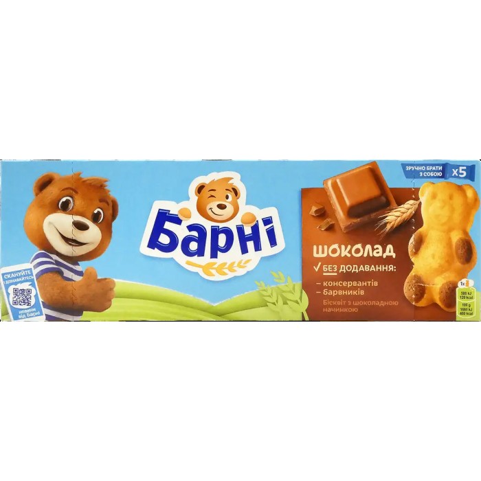 Бісквіт Барні з шоколадною начинкою - ніжний бісквіт у вигляді ведмедика з ароматним джемом. Він приготований на основі натуральних інгредієнтів, не містить барвників і консервантів, що робить його корисним, поживними та смачним. Кожен ведмедик в індивідуальному пакуванні з картонною основою, їх зручно брати з собою на пікнік або в подорож. Бісквіт із шоколадною начинкою чудово поєднується з йогуртом, молоком або соком.