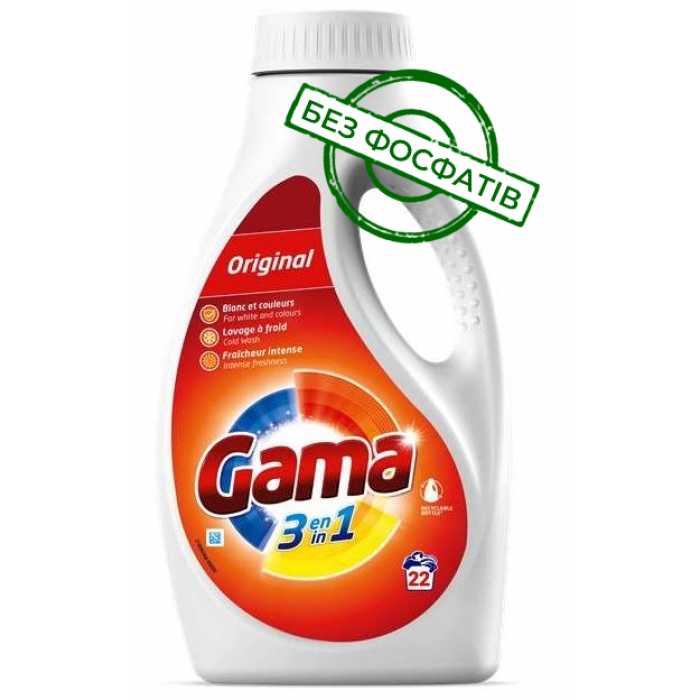 Гель Gama Original – це сучасний інноваційній засіб для прання, який забезпечить ідеальну чистоту та свіжість білизни, навіть у режимі коротких циклів прання у холодній воді. Завдяки потужній формулі для виведення плям на основі нового покоління ензимів він швидко та ефективно справляється з різного типу забрудненнями, підходить для прання білих та кольорових речей.