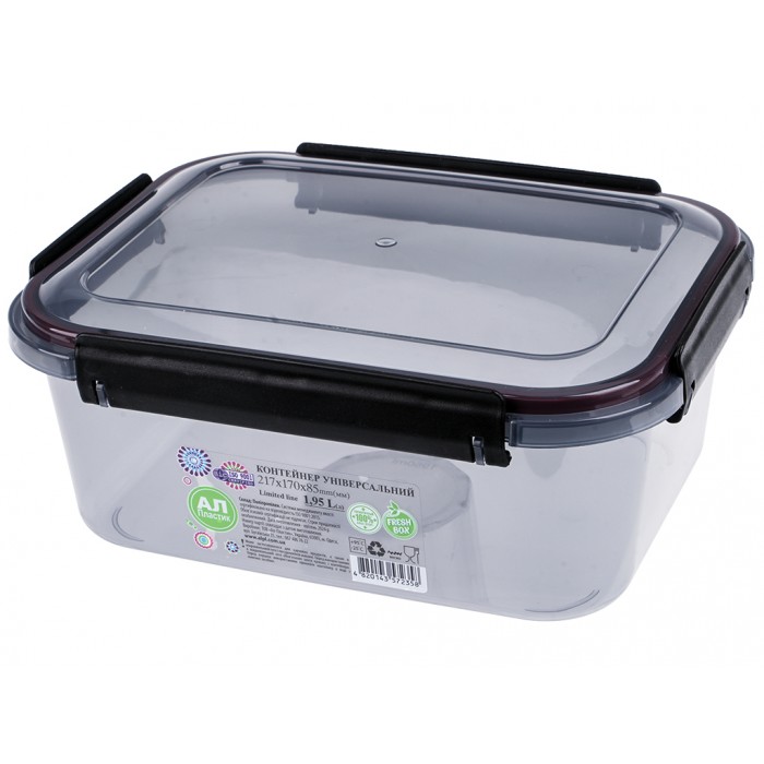 Контейнер харчовий Limited Line , Ал-Пластик, з герметичною кришкою, виготовлений з високоякісної харчової пластмаси, яка може контактувати з їжею, абсолютно безпечна для здоров'я, не містить шкідливих речовин, не вбирає сторонніх запахів і не має свого запаху. Завдяки екологічності сировини, з якої виготовлені пластикові контейнери, останнім часом продукція компанії Ал-Пластик стала популярною і використовується в побуті, ресторанах, їдальнях, кафе, магазинах, аптеках, швейних майстернях, офісах, складах. Не виділяє шкідливі елементи, відповідає європейським стандартам якості ISO 9001. Взаємодіє з харчовими продуктами, не змінюючи водночас їхніх смакових якостей і не впливаючи на аромат. Ємність для продуктів призначена для зберігання і транспортування свіжих і заморожених продуктів, ягід, фруктів, овочів, а також зручно використовувати для розігріву їжі в мікрохвильовій печі. Бокси контейнери з харчового пластику із засувками незамінні для тих, хто любить відпочивати на природі.