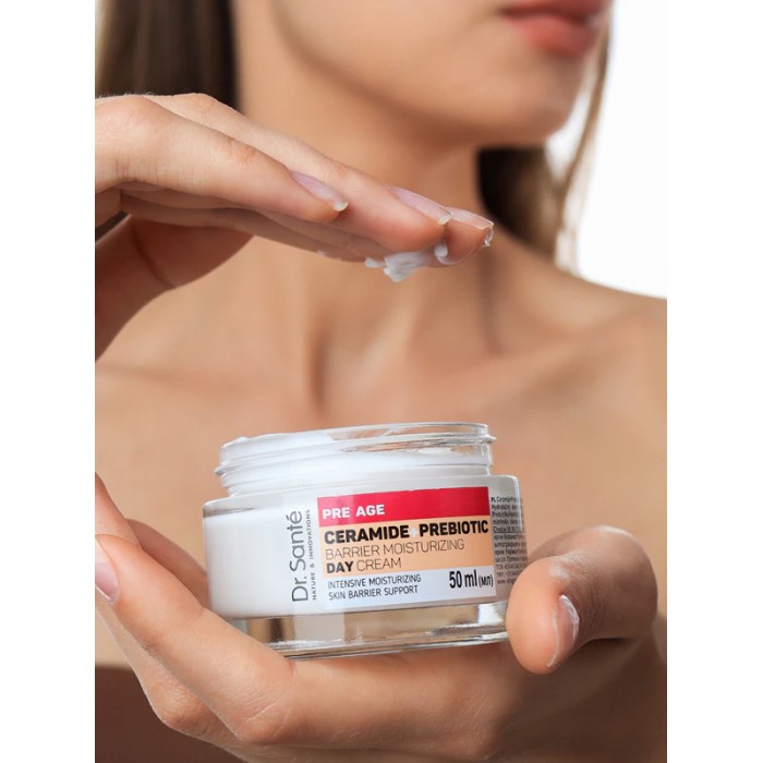 Зволожуючий крем ідеально підходить для сухої шкіри з першими ознаками вікових змін. Має легку текстуру, швидко поглинається, залишаючи відчуття зволоження. Керамід і пребіотик забезпечують шкірі підтримку захисного бар'єру та рівня зволоження. При використанні крему в ранковому beauty-ритуалі досягається миттєвий ефект зволоження, заспокоєння та комфорту шкіри. При регулярному застосуванні всіх засобів лінійки Pre Age від Dr.Sante шкіра надовго залишається насиченою вологою, еластичною та гладенькою.