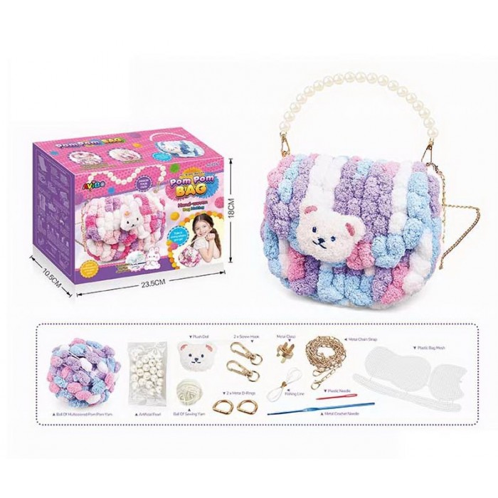 Набір для творчості дозволяє створити стильну та оригінальну сумку з м'яких помпонів. У комплект входять основа для сумки, нитки, фігурка тваринки, намистини, металевий ланцюжок, а також гачок і голка для зручного складання. В асортименті шість різних дизайнів, кожен із унікальною кольоровою гамою та декором. Така сумка стане чудовим аксесуаром для дитини або приємним подарунком, який можна зробити власноруч.