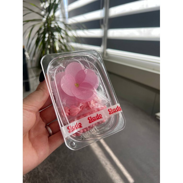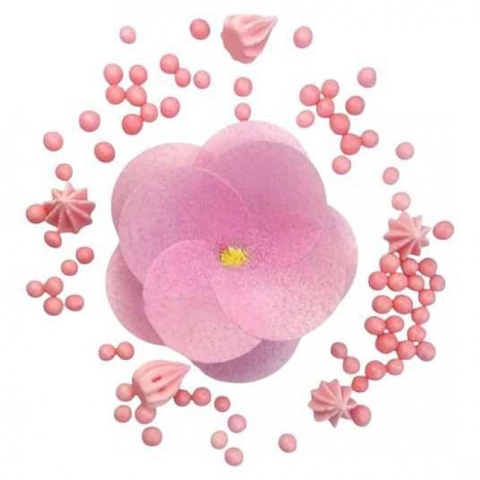 - Гармонійне поєднання: центральний елемент у вигляді ніжно-рожевої квітки доповнений розсипом цукрових перлин та фігурних декорі елементів, що створює завершену та професійну композицію.