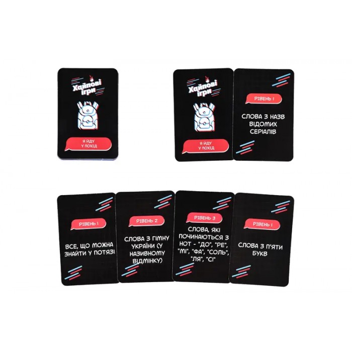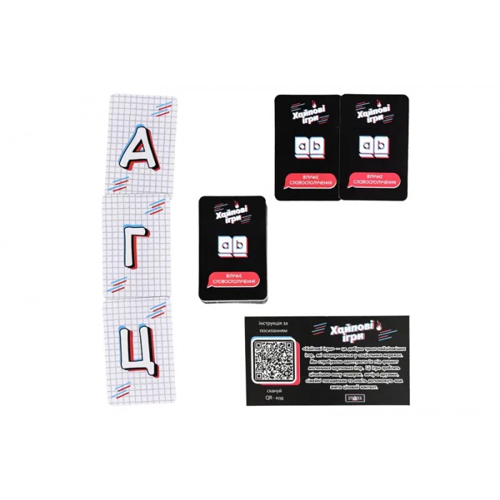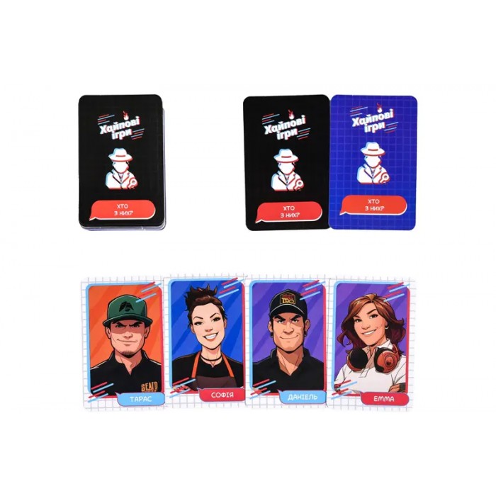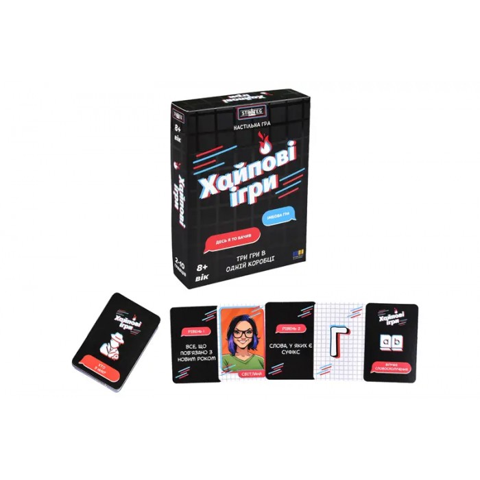 «Хайпові ігри» — це добірка трьох найцікавіших ігор із соціальних мереж в одній коробці. Вони створені для компаній друзів, що люблять логічні загадки, швидкі реакції та веселі інтелектуальні батли. №1. «Я йду в похід» — гра на логіку та кмітливість, у якій потрібно розгадати приховане правило ведучого й зрозуміти, що можна взяти з собою «в похід». №2. «Хто з них?» — швидка гра для двох, у якій треба відгадати персонажа суперника. Став запитання, на які можна відповісти лише «так» або «ні», і звужуй коло підозрюваних, доки не знайдеш правильну відповідь. №3. «Влучні словосполучення» — динамічна гра на швидкість і креативність. Гравці складають сталі словосполучення з двох випадкових літер. Хто першим назве правильне — забирає картку та стає ближче до перемоги.