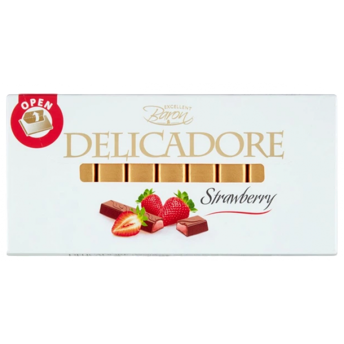 Шоколад Baron Delicadore Strawberry - це вишуканий порційний молочний шоколад, який поєднує в собі ніжність молочної основи та яскравий смак полуничного крему. Кожна плитка розділена на 12 окремих міні-стіків, загорнутих у золоту фольгу, що забезпечує зручність споживання та зберігає свіжість продукту. Елегантна упаковка з презентабельним виглядом робить ці солодощі чудовим вибором як для особистого споживання, так і для невеликого подарунка близьким чи колегам.