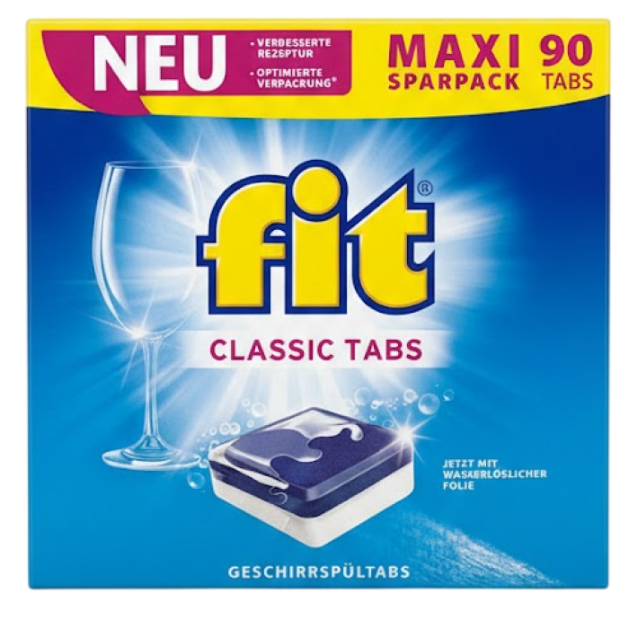 Відкрийте для себе fit Classic Tabs. Запатентована формула Blitz-Lausformula™ від fit Classic Tabs діє всього за кілька хвилин, надаючи вашим бокалам і посуді бездоганний блиск і ідеальну чистоту навіть при короткому циклі миття. Крім того, фактор захисту скла OZ 30™ запобігає корозії скла, а срібне захисне покриття дбайливо ставиться до вашої делікатної посуди. Для досягнення оптимальних результатів миття посуду використовуйте таблетки fit Classic Tabs у поєднанні з ополіскувачем fit і сіллю.
