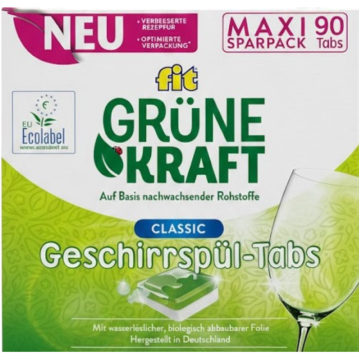Таблетки Fit Green Power Tabs Classic не тільки забезпечують чистоту посуду, але й захищають навколишнє середовище. У їх виробництві пріоритет віддається відновлювальним сировинним матеріалам і легкій біорозкладності. Високоактивні, екологічно чисті інгредієнти гарантують ідеальну чистоту.