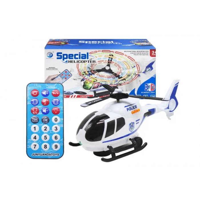 Дитячий музичний вертоліт. При включенні іграшка починає їздити в хаотичному напрямку і створює світлові і звукові ефекти. Пропелер крутиться. Буде хорошим подарунком для дитини від трьох років. Працює від трьох батарейок типу АА. Пульт працює від батарейки типу СR.