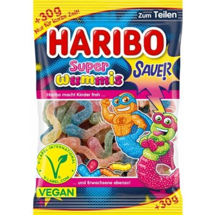 Кисло-сладкие желейки Haribo Super Wummis Sauer - это настоящий взрыв фруктового вкуса в каждом кусочке! Веселые «червячки» от Haribo имеют хрустящую сахарную обсыпку, жевательную текстуру и яркие вкусы - от малины до лимона. Эти желейки изготовлены без желатина и подходят для веганов, поэтому каждый может наслаждаться любимым вкусом без компромиссов.